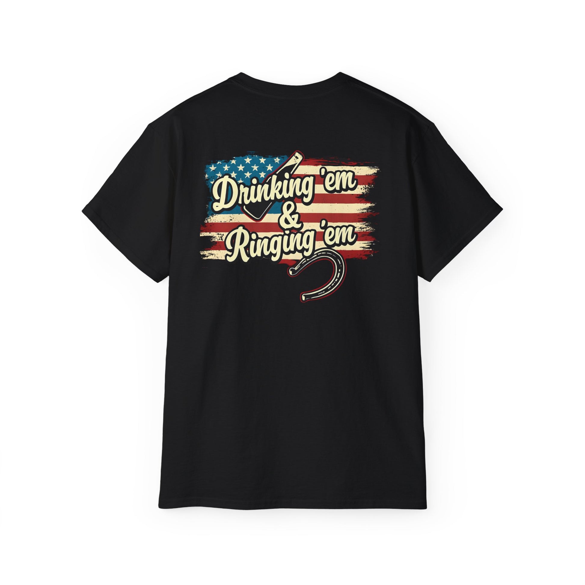 Some call it a game, others call it a lifestyle. Whether you're tossing ringers or raising a cold one, this tee says it all. The Drinking 'Em & Ringing 'Em shirt is made for those who know that good times and good throws go hand in hand. Perfect for league nights, tournaments, BBQs, or just cracking one open with your horseshoe crew.